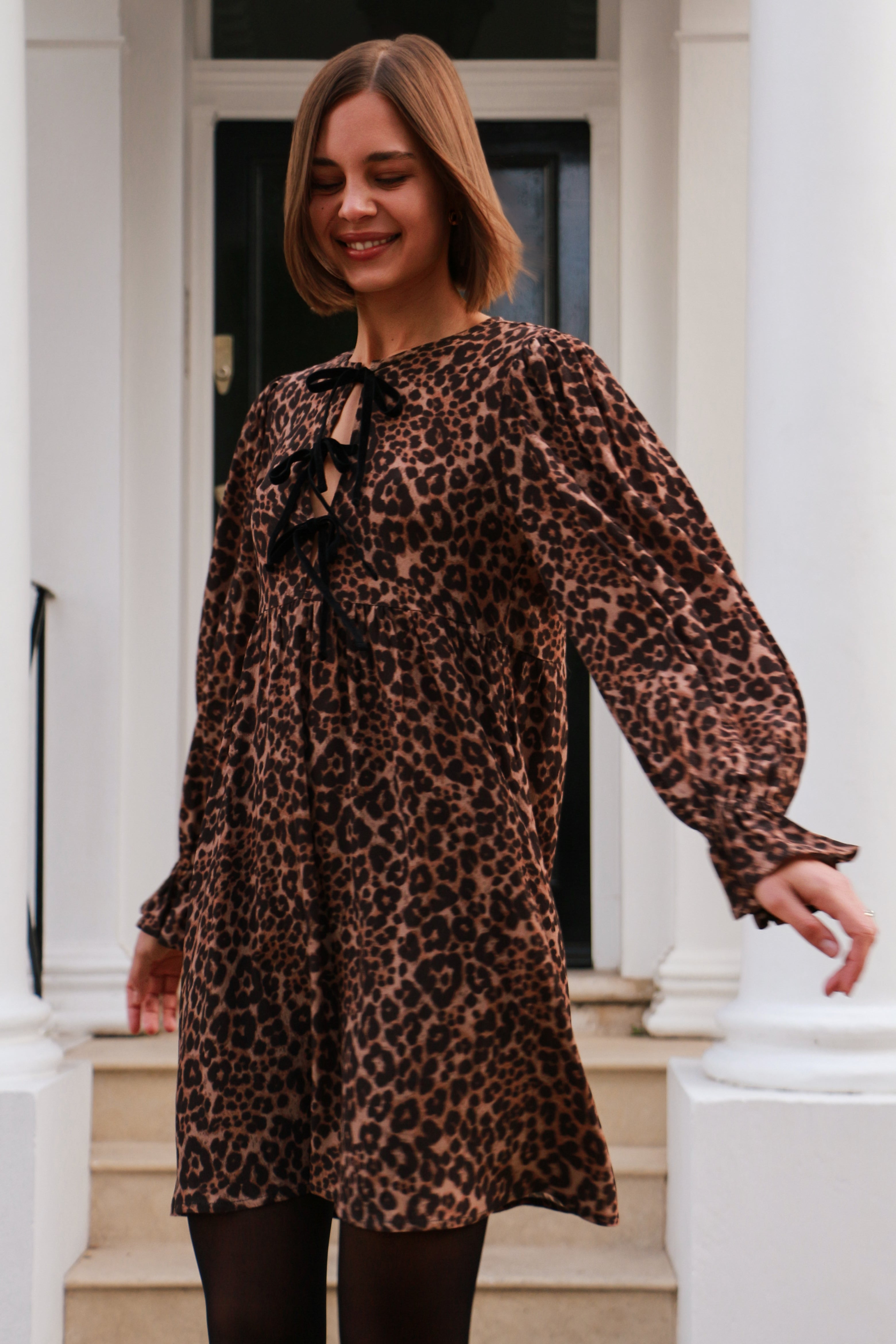 Chloe is the leopard-print mini dress designed for every occasion. Made from floaty and fluid viscose crepe, with velvet ties and softly frilled sleeves, Chloe is perfect with boots for daytime chic or heels for after-dark elegance.
