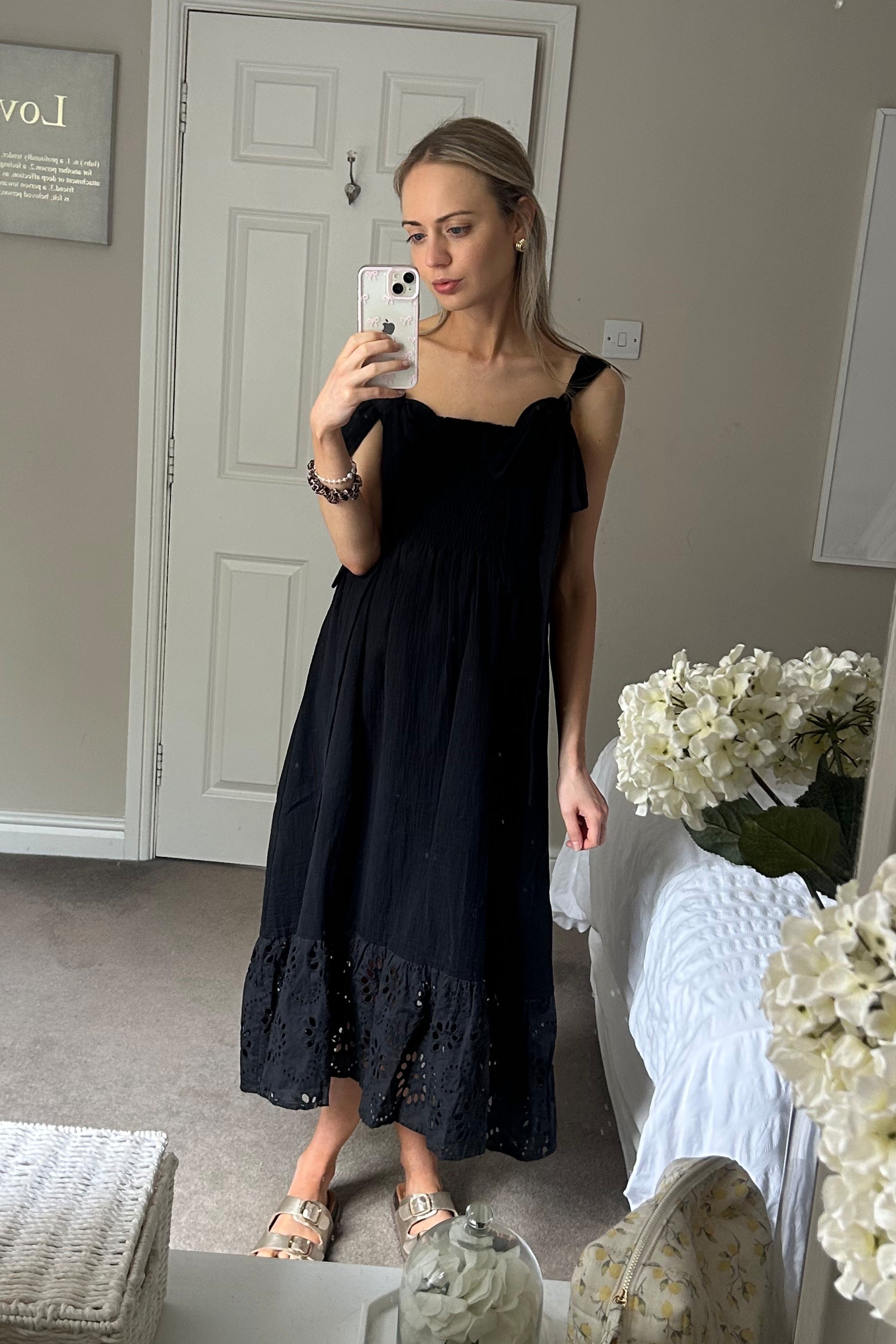 Meet Elise, the perfect little black dress for sunshine-filled days. Crafted from 100% cotton gauze, Elise is as breezy as it is beautiful. The flattering shirred bust ensures a comfortable, flexible fit, while delicate self-tie straps and a statement oversized broderie frill add a touch of romance. Forever chic and perfect for warm weather occasions, Elise is a timeless summer staple.