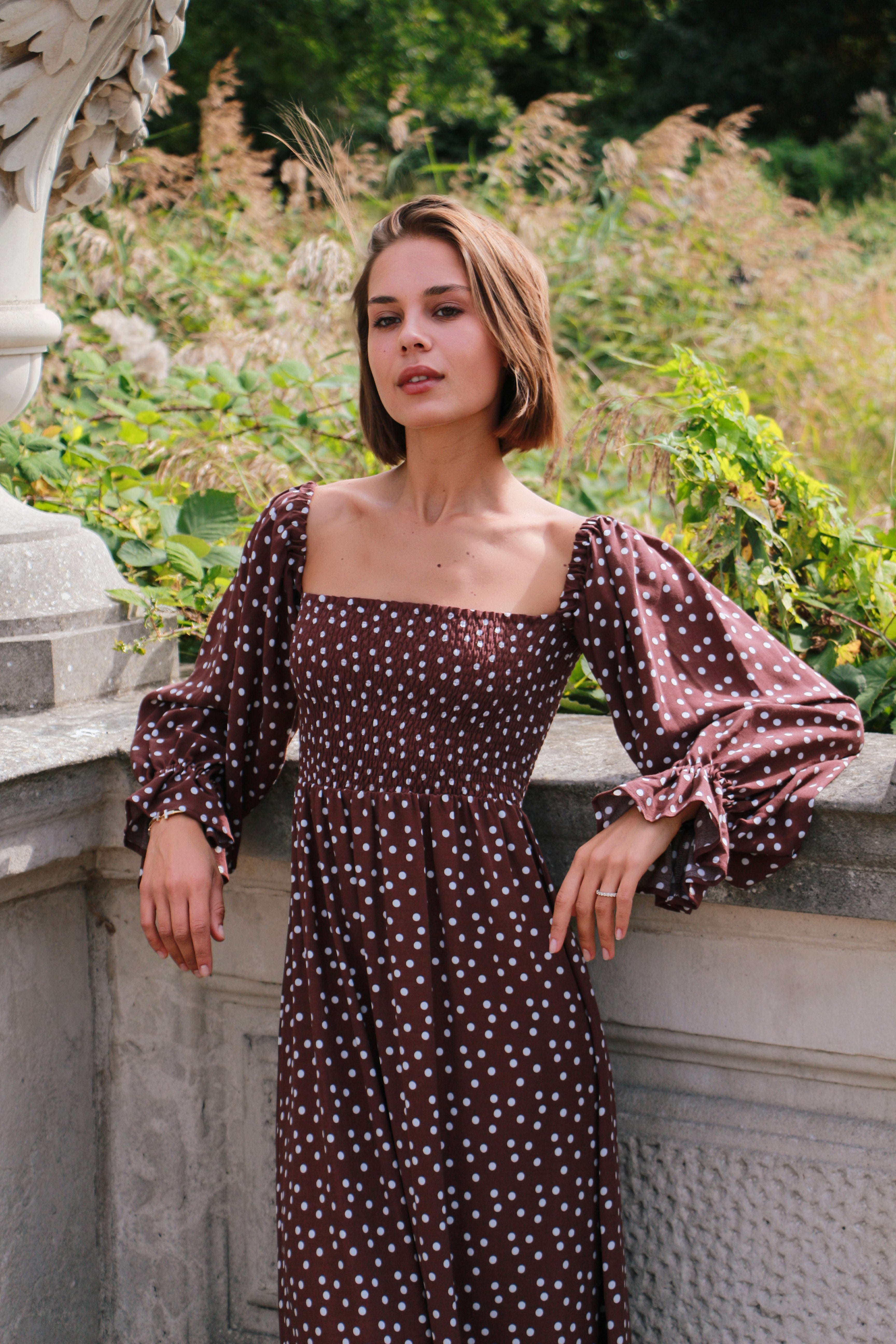 In gorgeous, rich chocolate brown crepe, scattered with playful cream polka dots, the Annabelle Dress is a modern take on timeless romance. With its swish-worthy skirt, billowy balloon sleeves and universally flattering shirred bust, Annabelle is endlessly wearable, promising timeless elegance from morning to night.