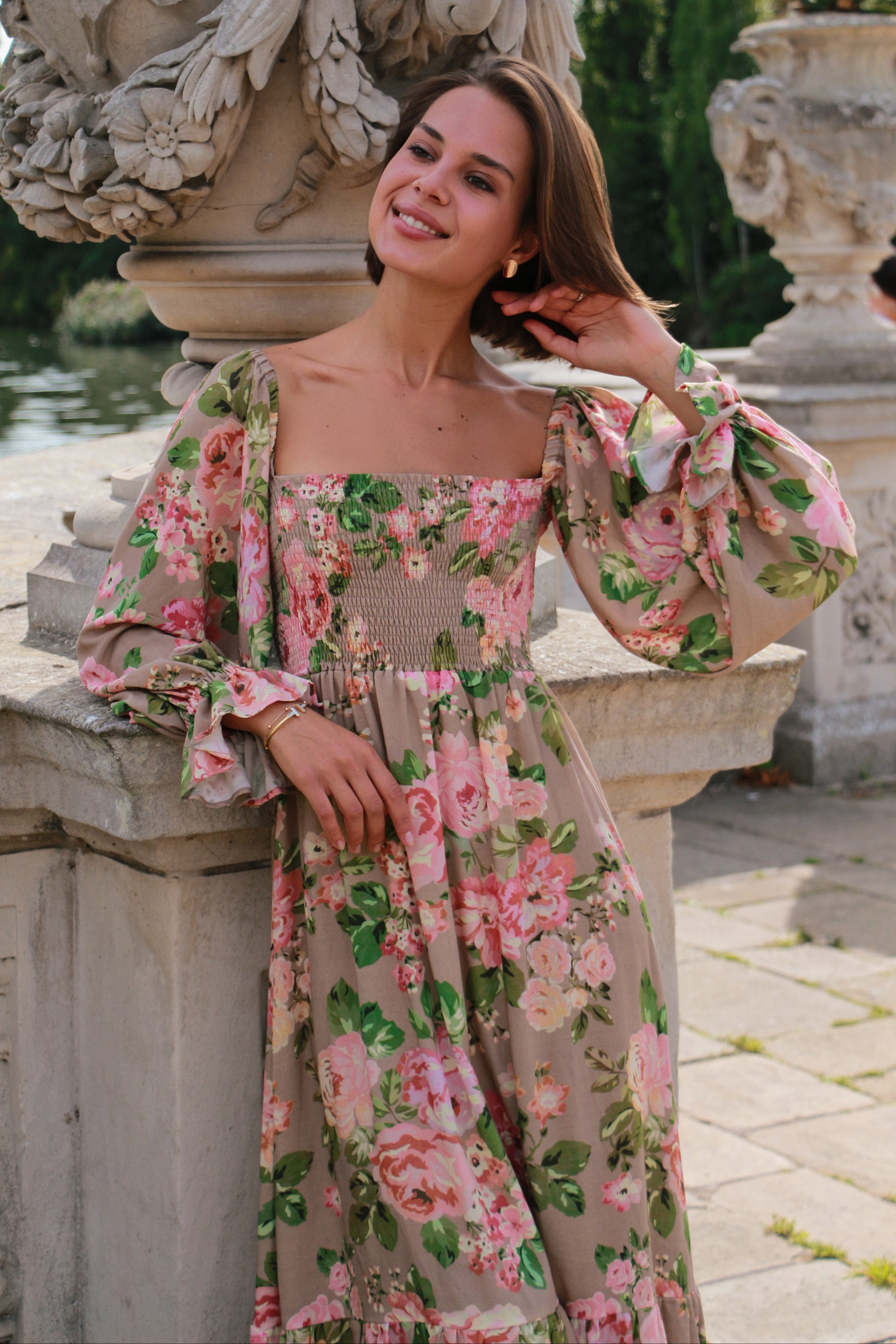 In dusky taupe crepe adorned with beautiful pink blooms, the Eloise dress is the epitome of effortless romance. With a shirred bodice and flowing skirt, Eloise flatters every figure beautifully, balancing timeless femininity with easy-wear appeal. Just pair with boots or heels for an effortlessly chic look whatever the occasion.