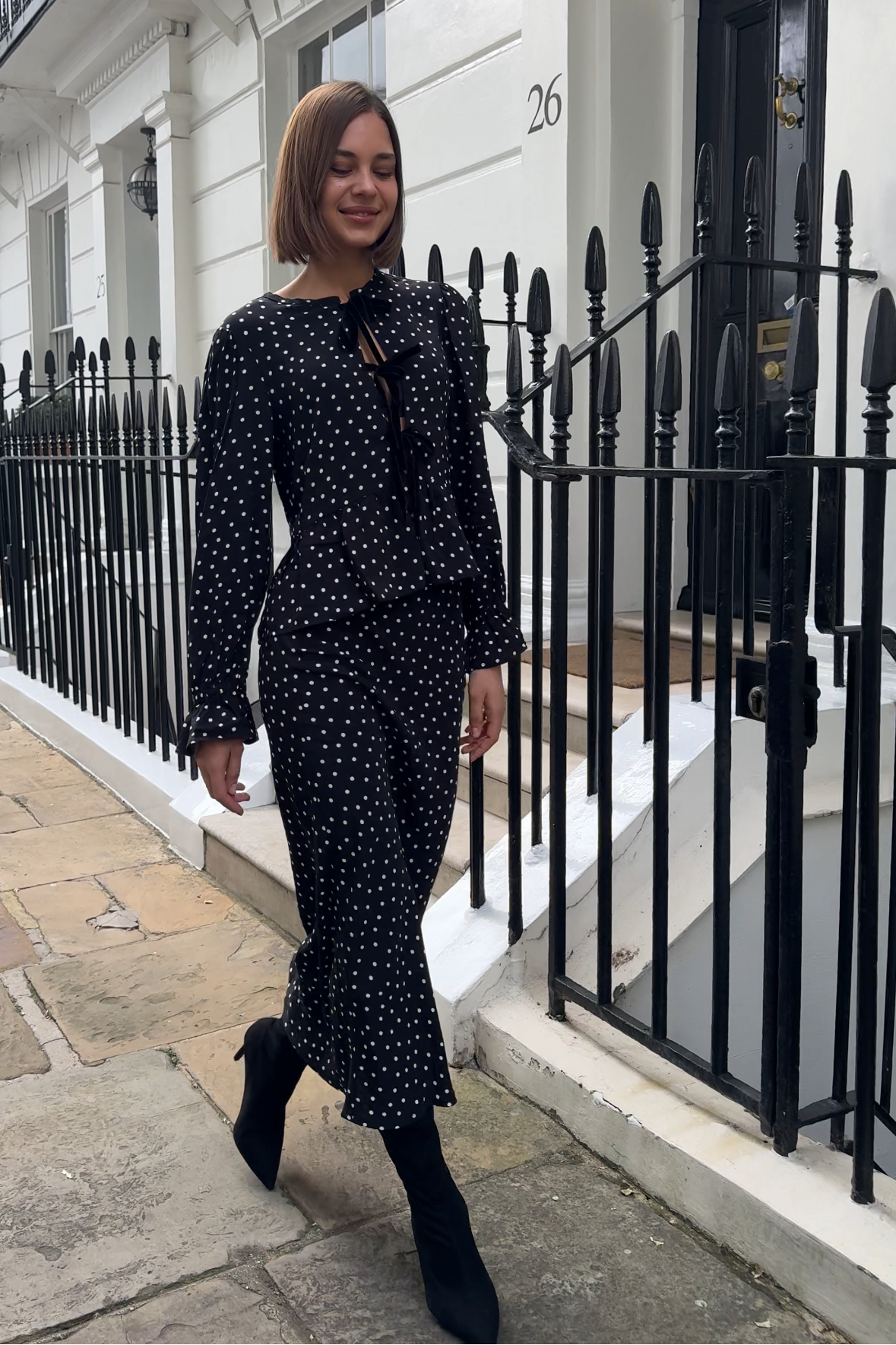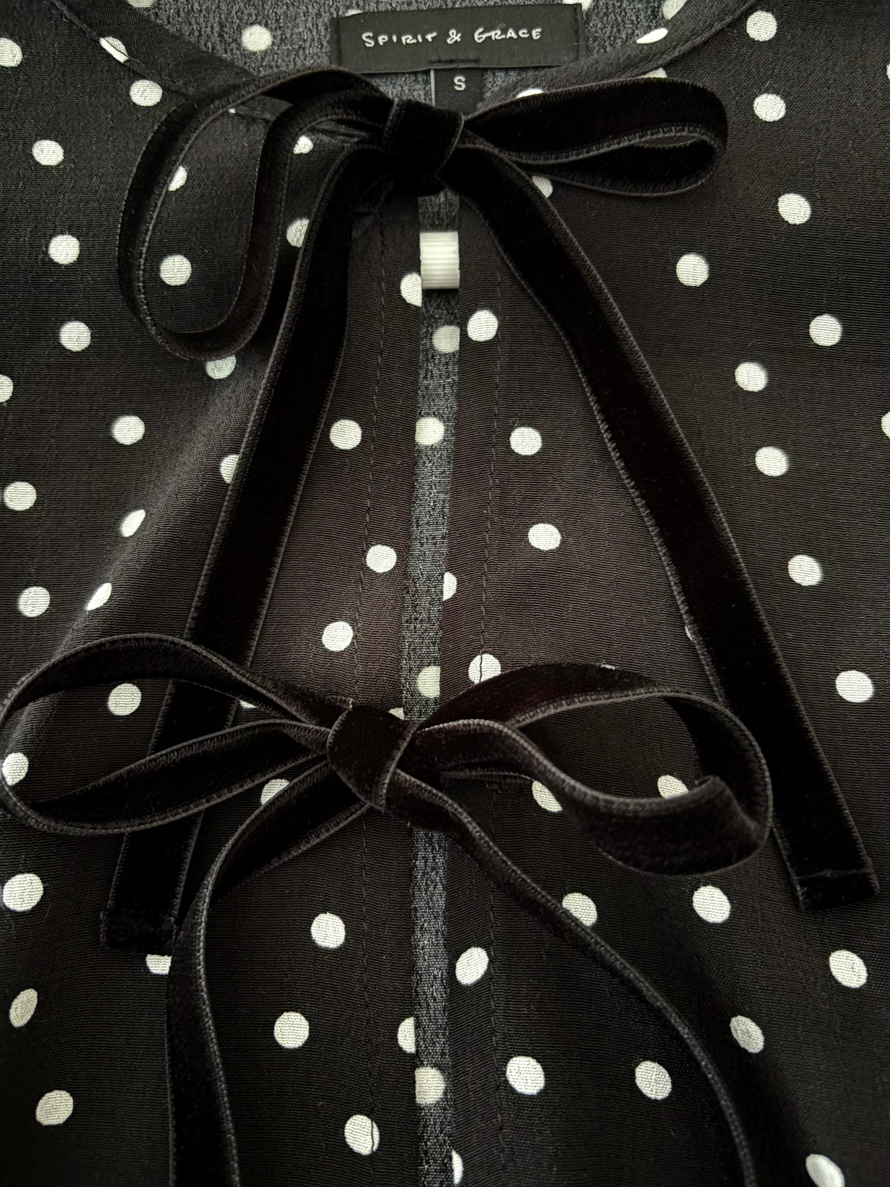 Meet the Eve Blouse, a modern romantic in classic black and white polka dots. Crafted from 100% viscose, Eve features a peplum frill and beautiful velvet ties that fasten into soft bows down the front. Effortlessly elegant and endlessly versatile, Eve pairs perfectly with denim or tailoring for a polished everyday look.